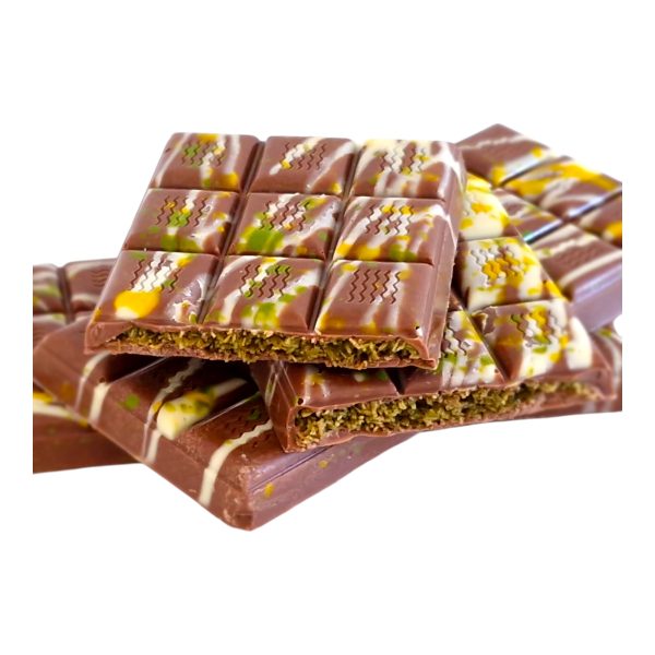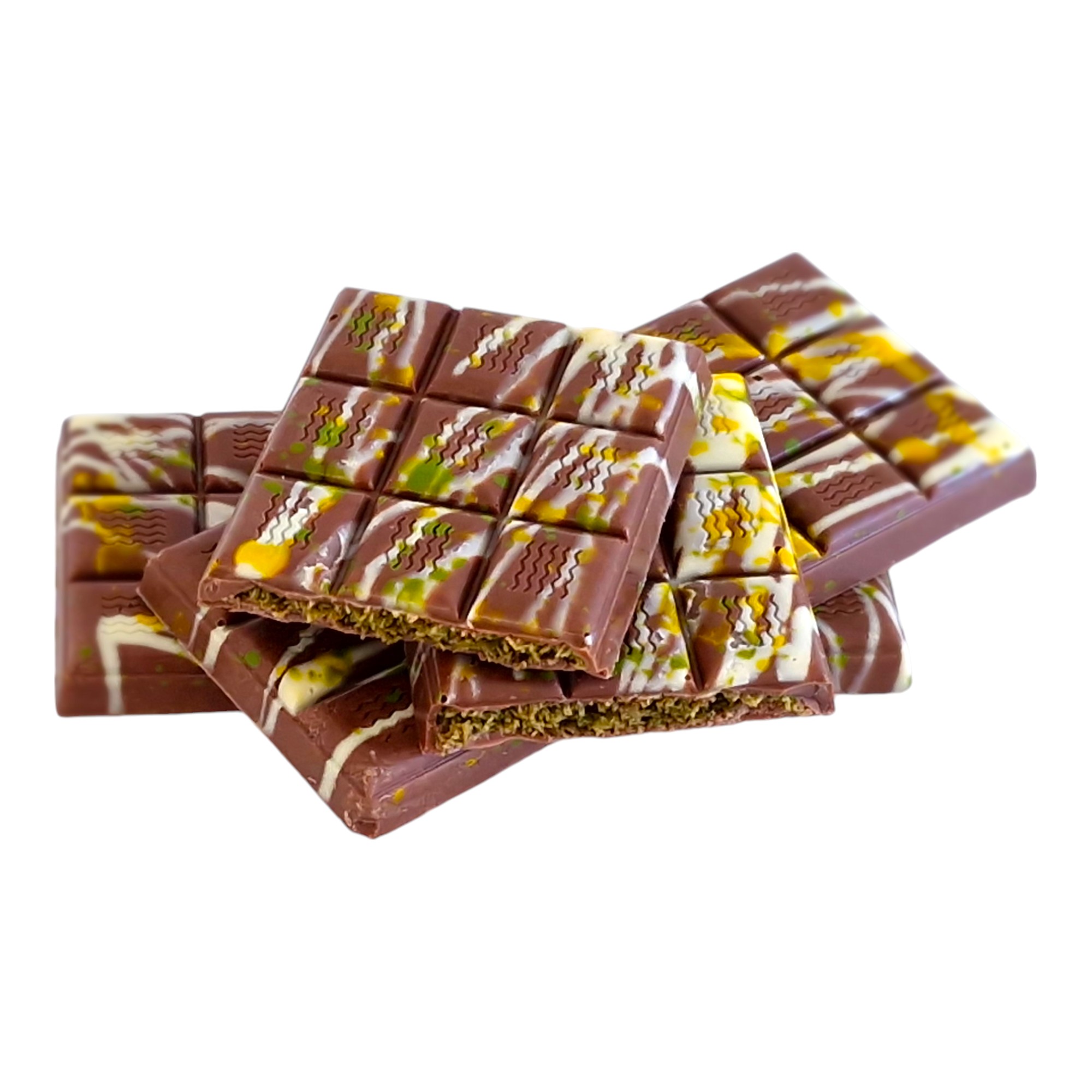 Ciocolata cu lapte [Emulsifiant: Lecitine (E 322)], (Zahar 42.0%, unt de cacao 24,0%, lapte praf integral, masa de cacao, emulgator: lecitina din soia, aroma naturala vanilie), Insertie Kunafa (Kataif [faina de grau, apa, sare, ulei], Ganache Ciocolata alba [MLEKOVITA FRISCA UHT 36% (Conține Lapte), Ciocolata alba [Emulsifiant: Lecitine (E 322)]], Pasta fistic prajit, Fistic