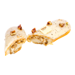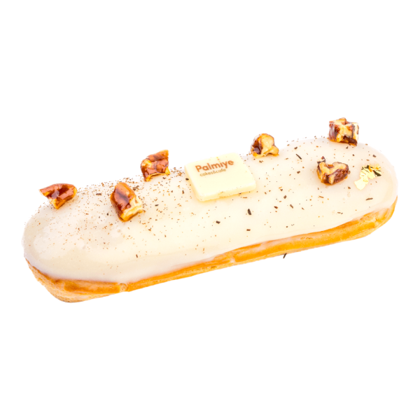 Eclair sau dovada simplitatii sofisticate! Din aluat fraged choux, umplut cu crema de vanilie delicioasa, crema de praline si la final invelit in glazura de vanilie, decorat cu nuci pecan caramelizate.