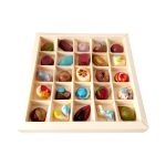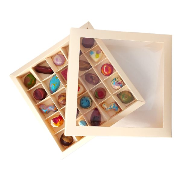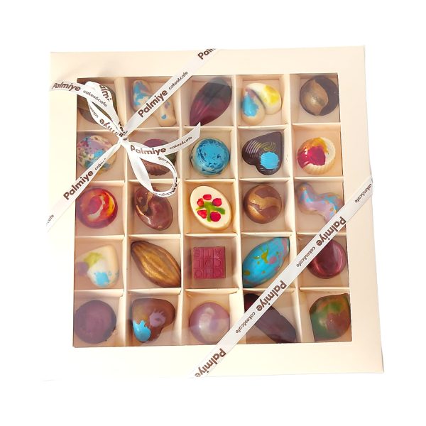 Cutie cu 25 praline cu ciocolata alba si neagra si umplutura cu infuzie de fructe ( portocale, mango, limoncello, zmeura, mure, busuioc), un cadou ideal atat pentru cei dragi, cat si pentru partenerii de afaceri sau colegii de birou.