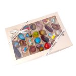 Cutie cu 28 praline cu ciocolata alba si neagra si umplutura cu infuzie de fructe (portocale, mango, limoncello, zmeura, mure, busuioc), un cadou ideal atat pentru cei dragi, cat si pentru partenerii de afaceri sau colegii de birou.