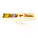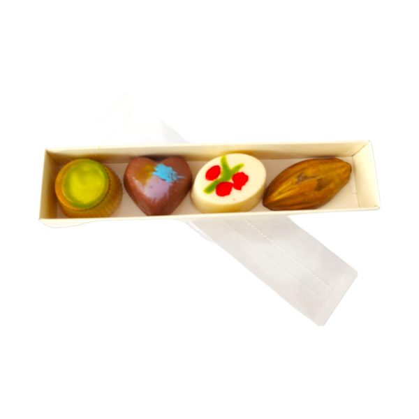 Cutie cu 4 praline cu ciocolata cu lapte si umplutura cu crema, un cadou ideal atat pentru cei dragi, cat si pentru partenerii de afaceri sau colegii de birou.