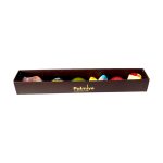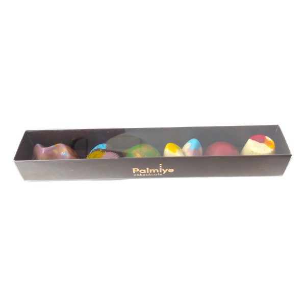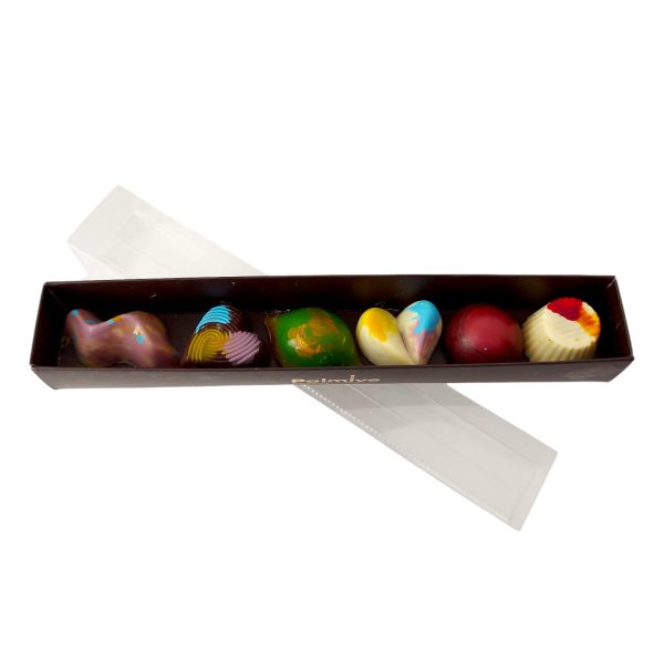 Cutie cu 6 praline cu ciocolata alba si neagra si umplutura cu infuzie de fructe (portocale, mango, limoncello, zmeura, mure, busuioc), un cadou ideal atat pentru cei dragi, cat si pentru partenerii de afaceri sau colegii de birou.