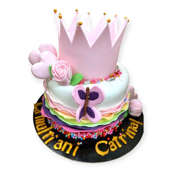 Ruffled Crown Cake este un tort desăvârșit pentru evenimente speciale. Cu o explozie de nuanțe roz și un design plin de viață, acest tort emană bucurie și veselie. Cu o coroană magnifică care domină decorul, fiecare detaliu este atent lucrat pentru a aduce zâmbete pe chipurile micilor prințese și nu numai. Poate fi comandat cu una din compozițiile Palmiye. Este acoperit cu pastă de zahăr și decorat manual.